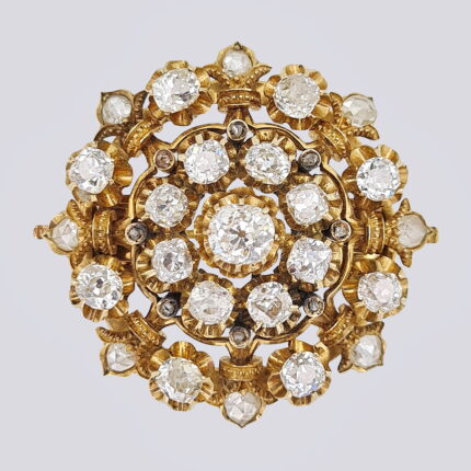 Антикварная золотая брошь 56 пробы с бриллиантами старой огранки и алмазами