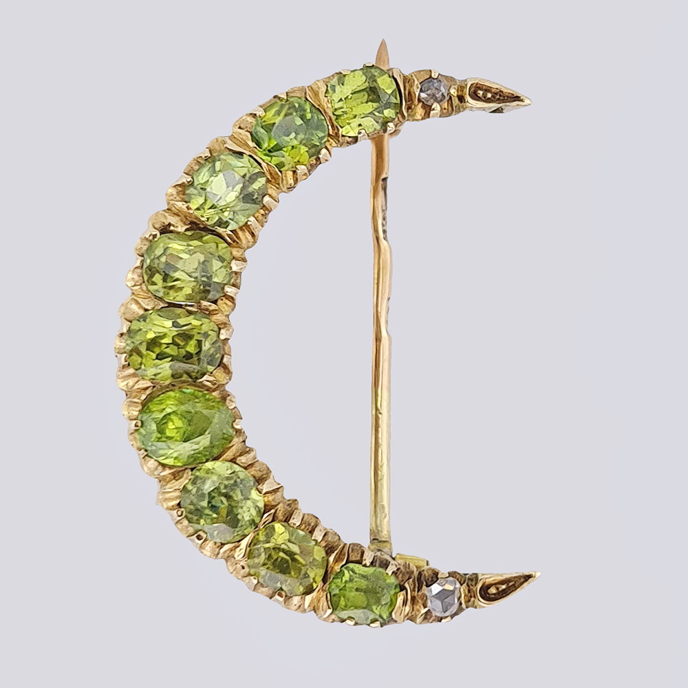 Антикварная золотая брошь «Полумесяц» с демантоидами и хризолитами