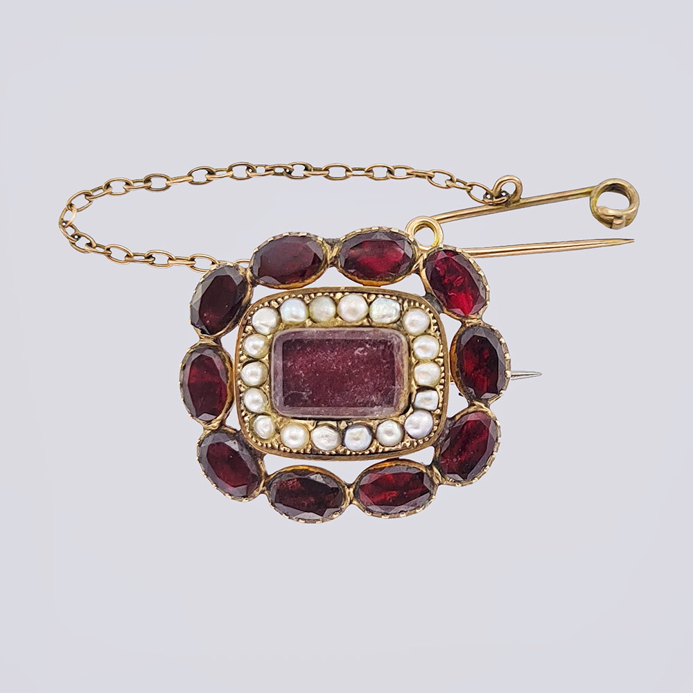 Антикварная брошь с булавкой, с гранатами и жемчугом