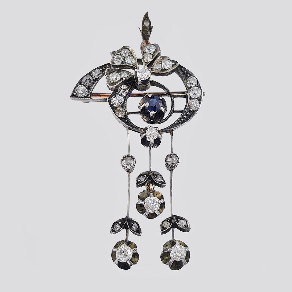 Антикварная золотая брошь-подвеска 56 пробы с бриллиантами старой огранки алмазами и природным сапфиром