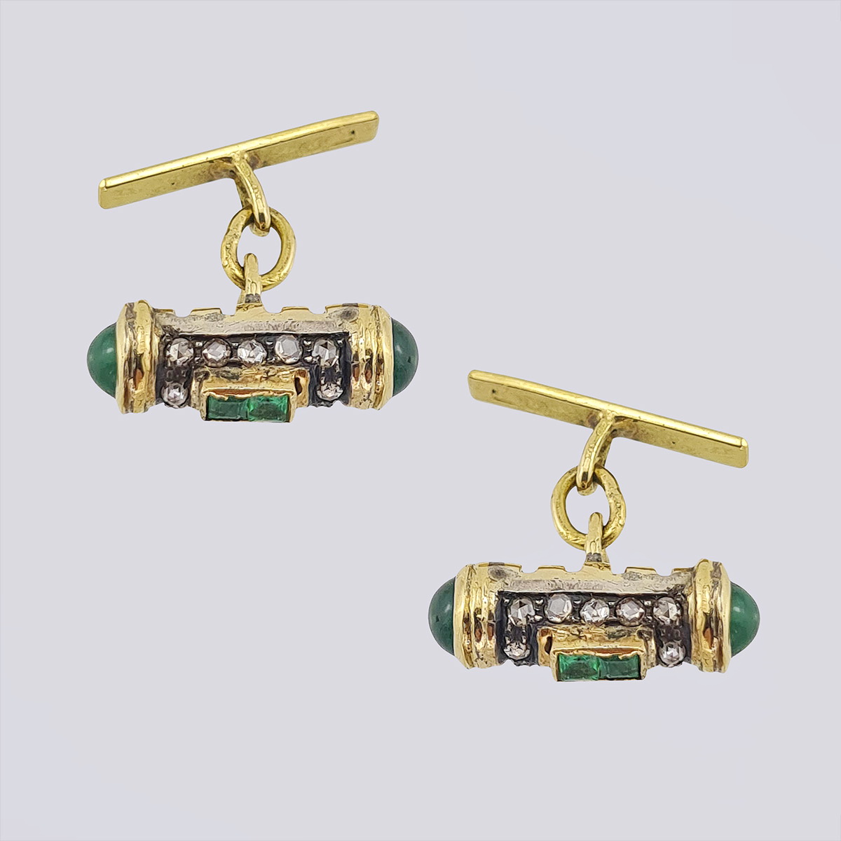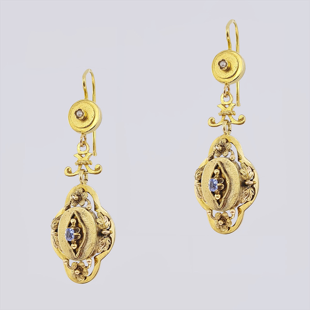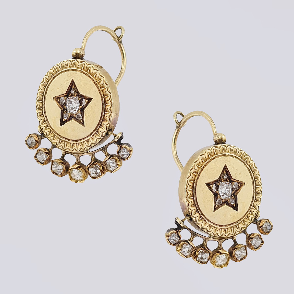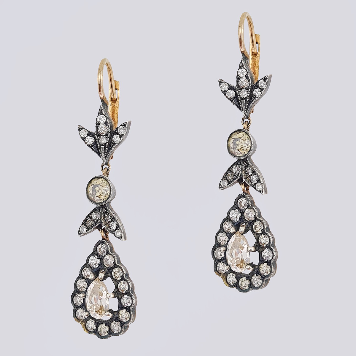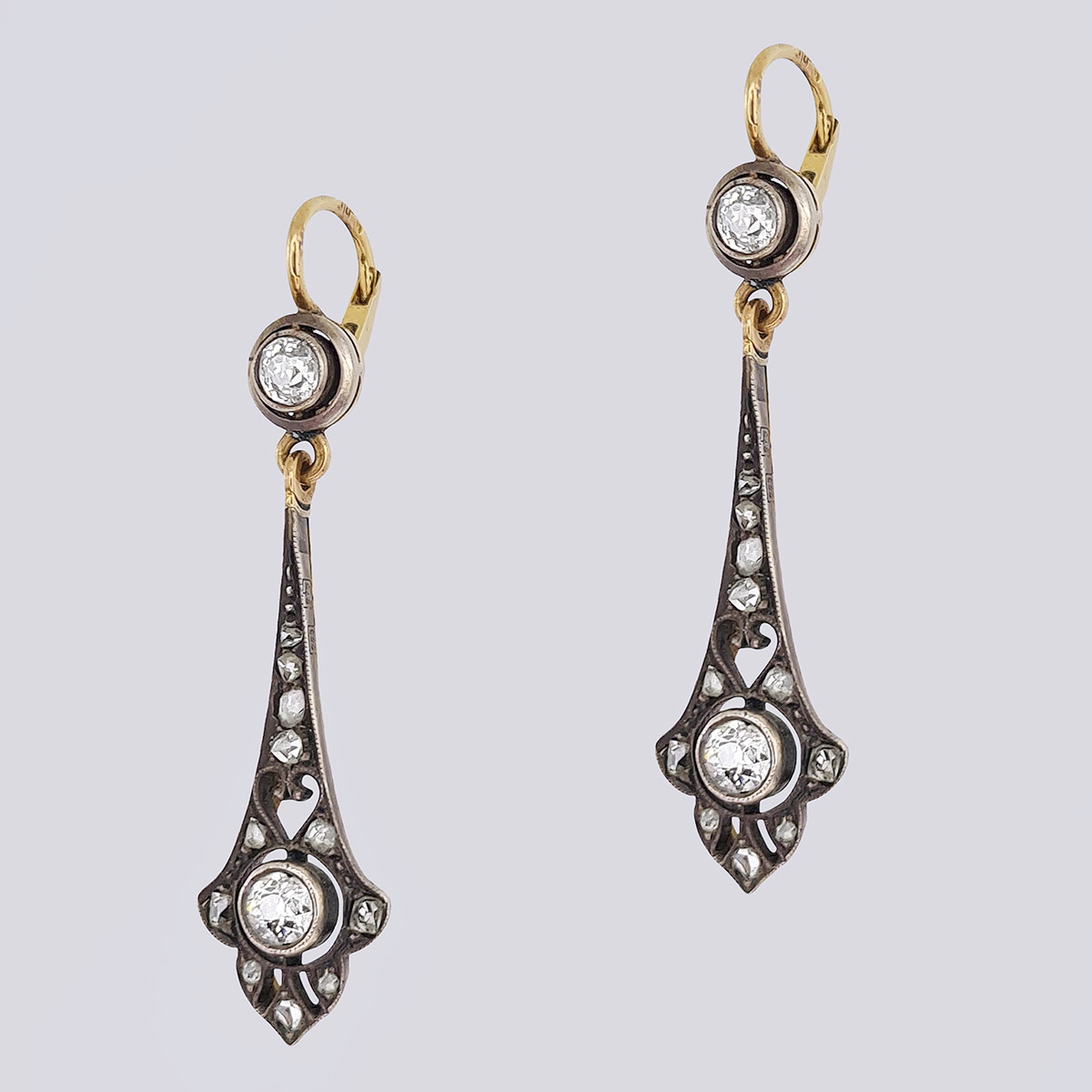 Антикварные золотые серьги-подвески с бриллиантами старой огранки и алмазами