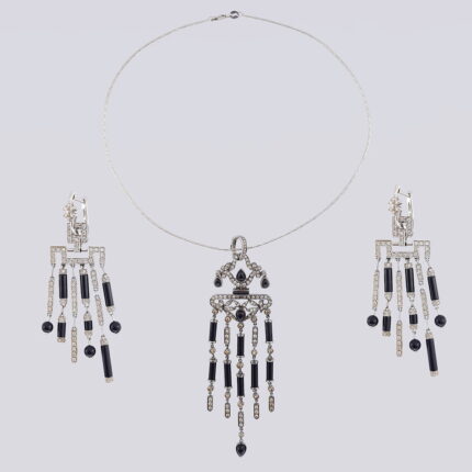 Комплект — серьги, колье и цепь из золота 750 пробы с бриллиантами и агатами
